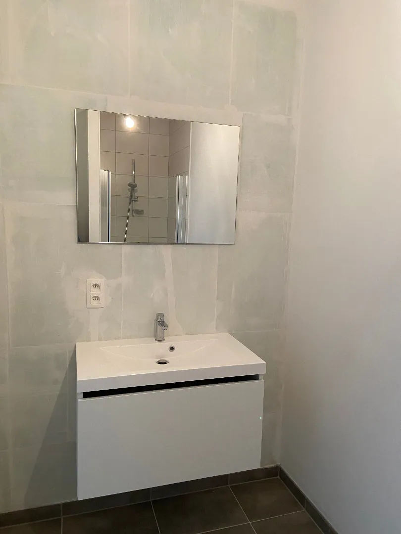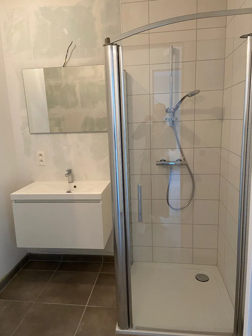 Het appartement omvat inkom, living, volledig ingerichte keuken met vaatwas, badkamer met douche, apart toilet, 1 slaapkamer
