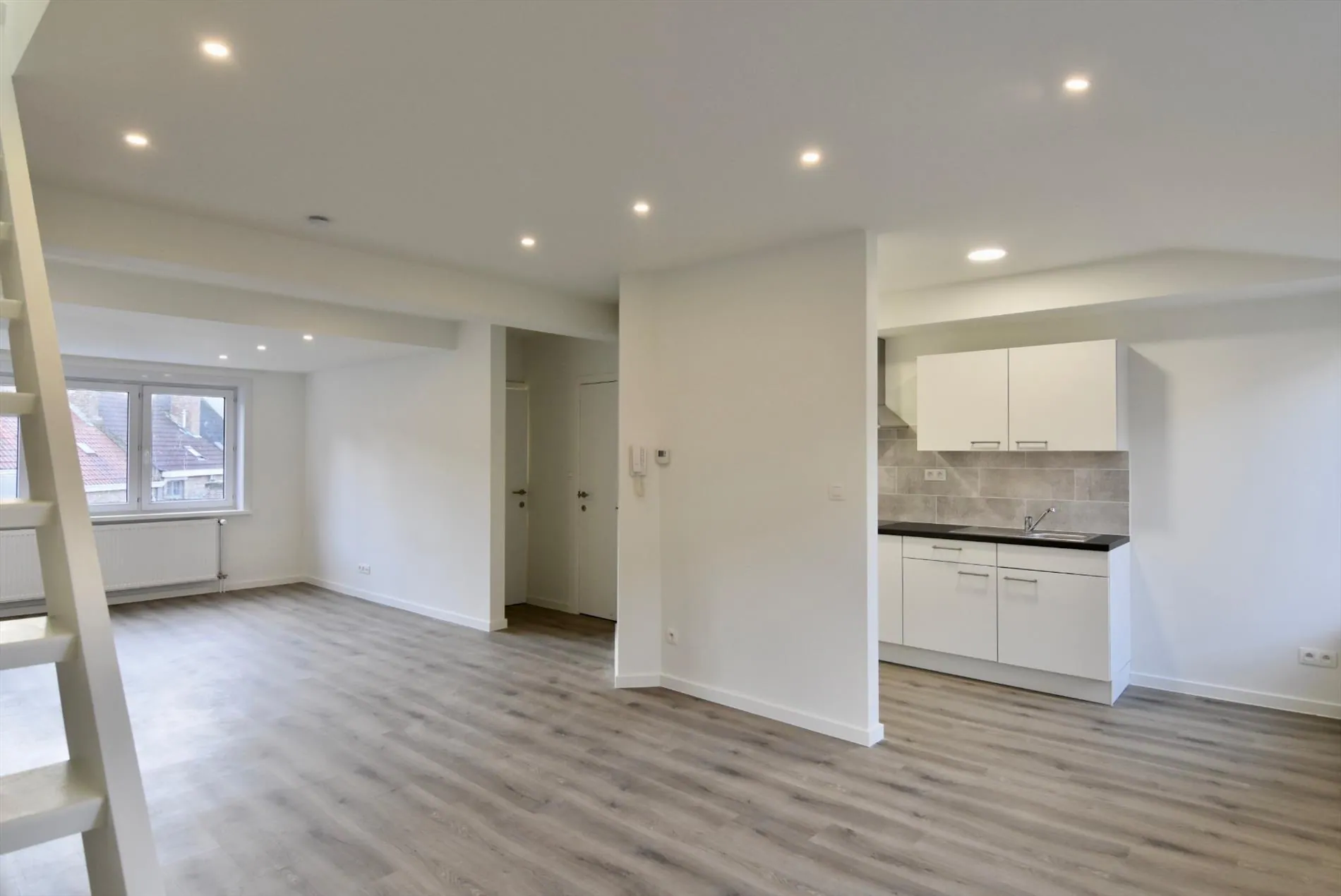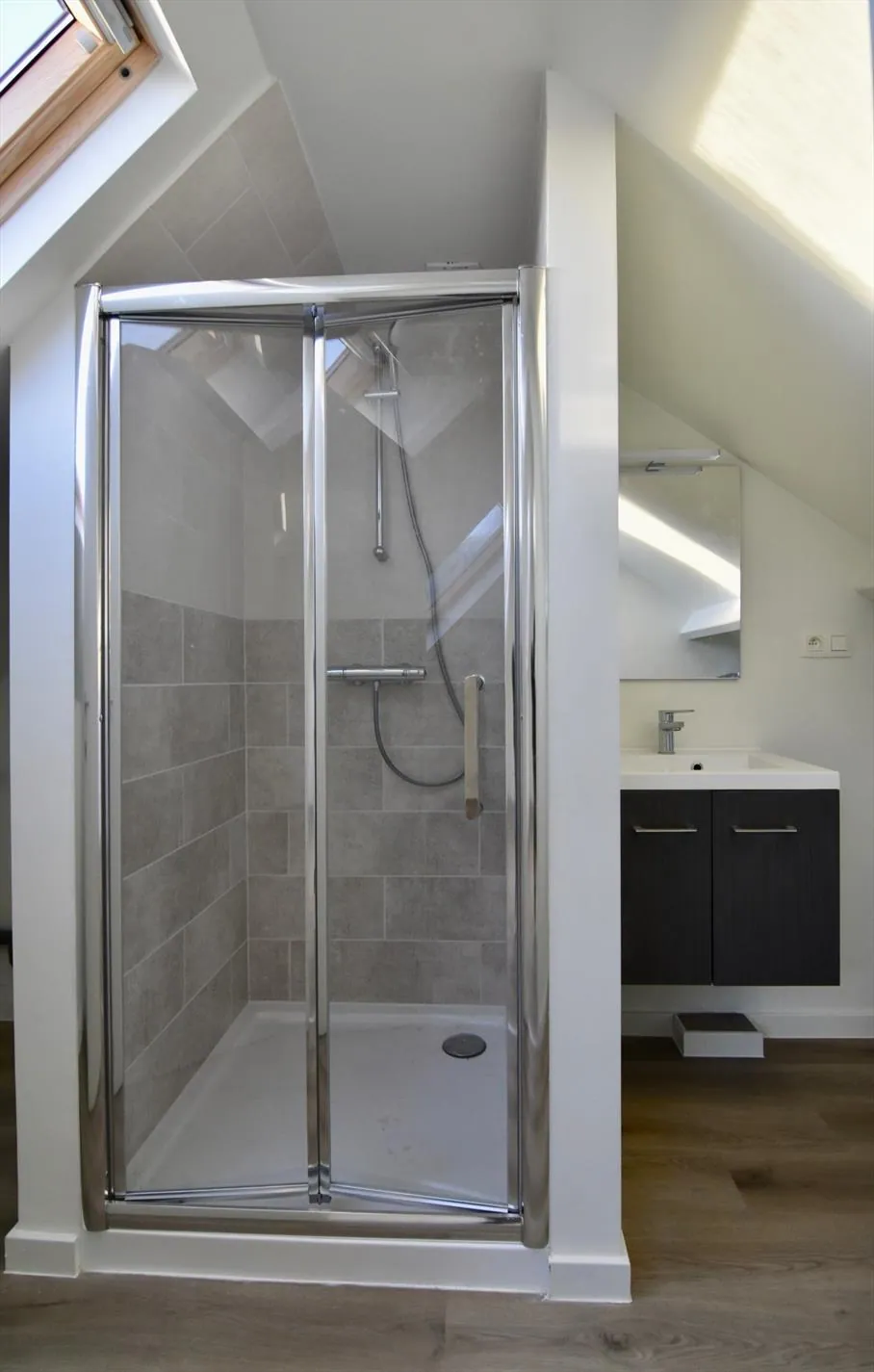 Op de bovenste verdieping word je aangenaam verrast door de mooie open ruimtes en natuurlijke lichtinval door de vele raampartijen. Dit dakappartement omvat : Inkom met toilet, ruime woonkamer met half open ingerichte keuken, slaapkamer onder de nok met aansluitend moderne badkamer met instapdouche.