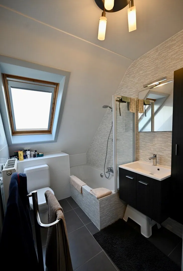 De twee slaapkamers, badkamer en berging bevinden zich op de bovenste verdieping van dit knusse appartement.