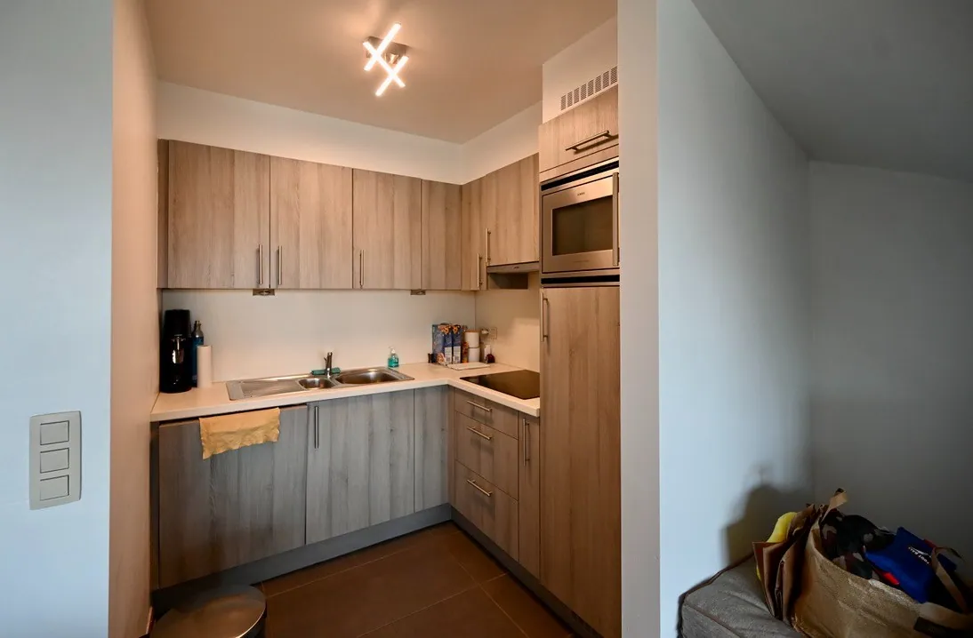 Dit mooi appartement beschikt over een kleine inkomhal met gastentoilet, ruime woonkamer met volledig ingerichte open keuken en ruim terras met magnifiek ver-zicht en volledige privacy.