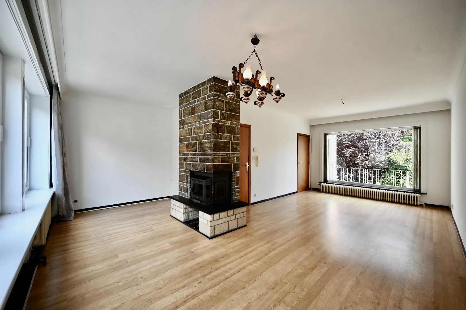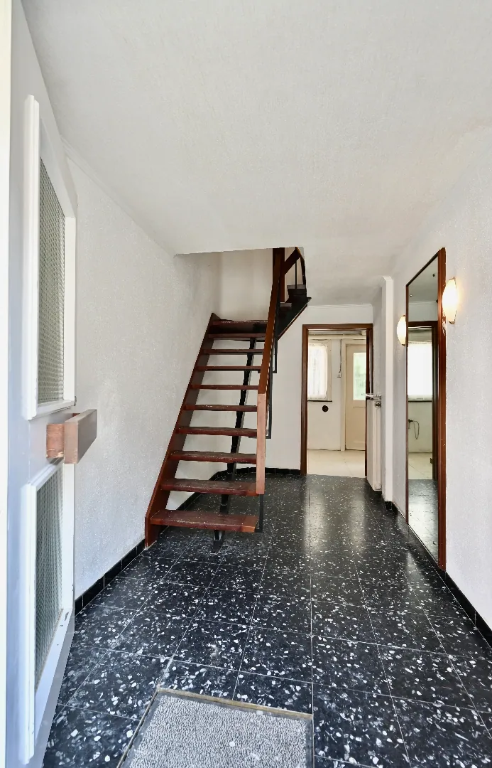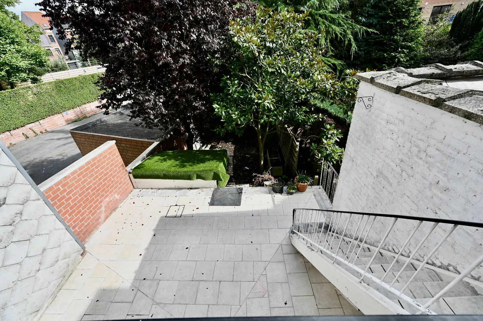 Aansluitend aan woonkamer en keuken bevindt zich een terras met trap naar het gelijkvloerse terras met zuidgerichte tuin.