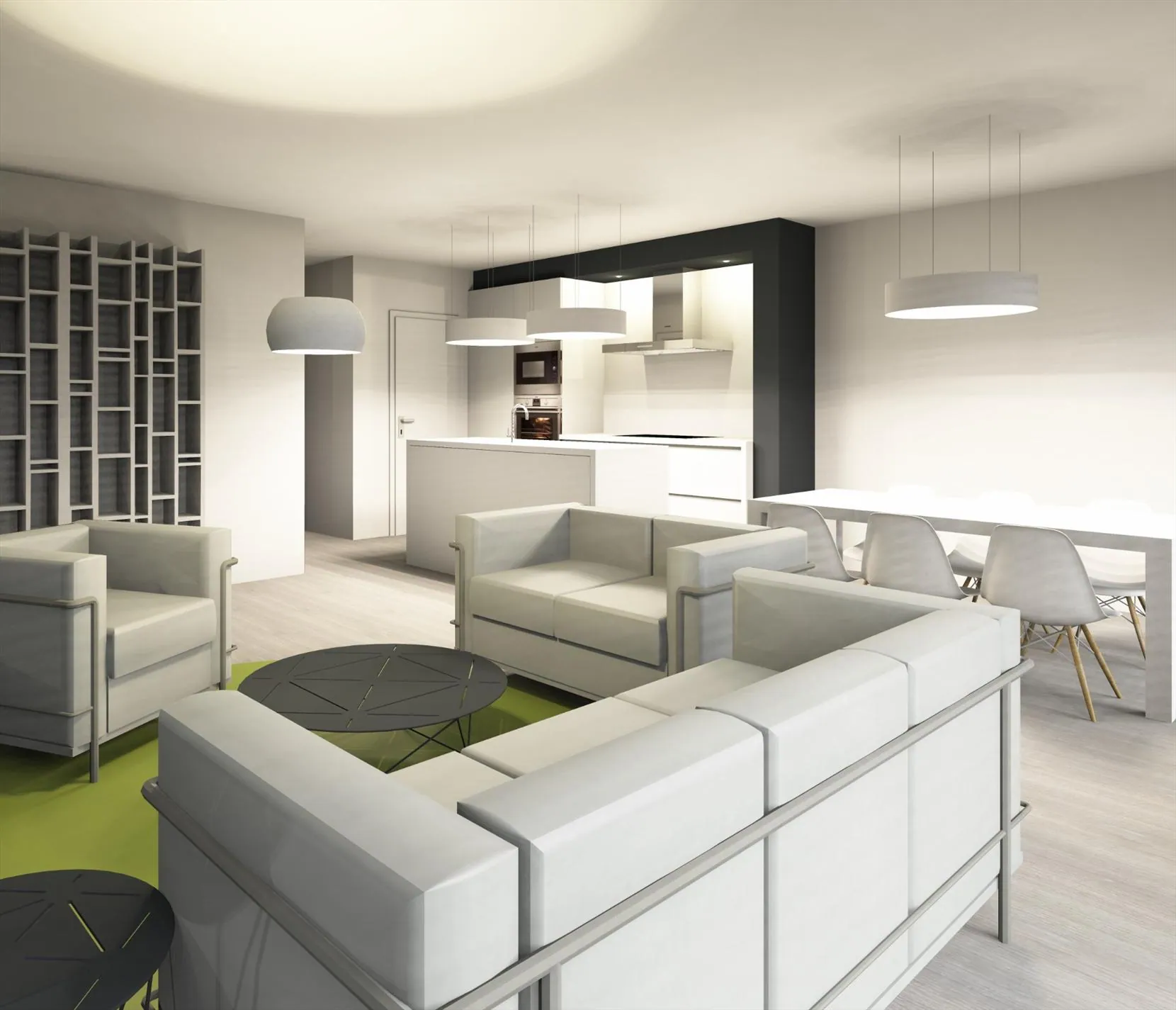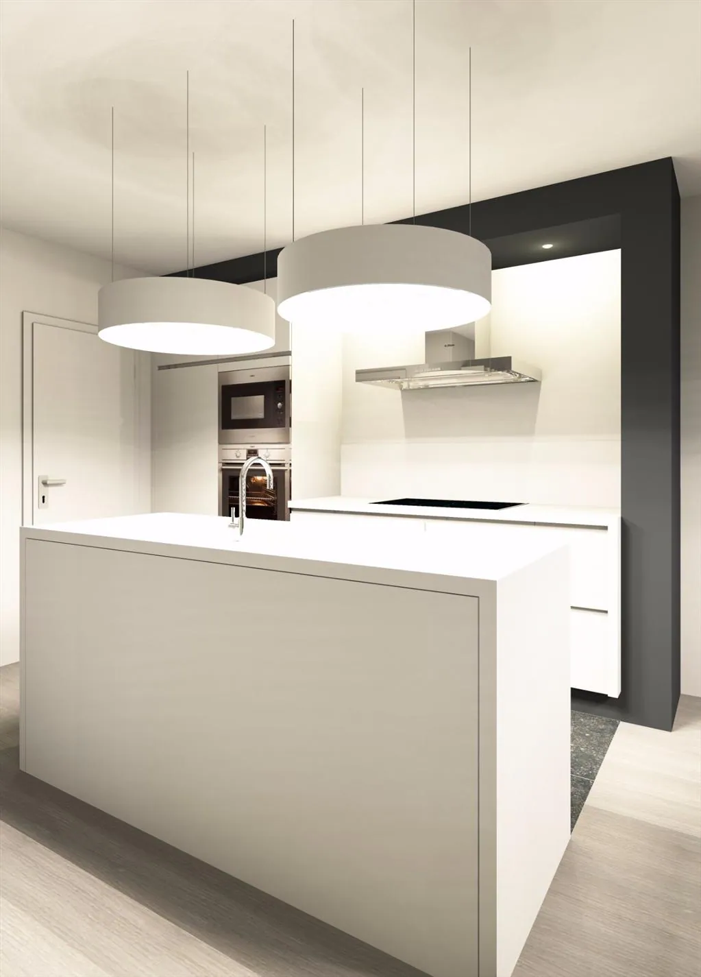 Woning voorziet hall met gastentoilet, ingerichte keuken en ruime living met raampartijen die uitkijken op de perfect zuid-gerichte tuin en garage met sectionale poort.